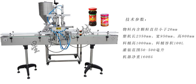 贵阳南明老干妈风味食品有限责任公司成立以来我们始终如一地认为,“老干妈”这个品牌是我们广大的消费者、是在我们的各级行政管理部门精心呵护下成长起来的品牌,虽然创造品牌的主体是老干妈公司,但这一品牌更是社会的,是广大消费者溶入了浓浓亲情的品牌。佳木斯包装机所生产的双头全自动辣椒酱灌装机是星火公司专门针对香辣酱产品进行定量灌装的一种新型灌装设备,在使用上分为自动香辣酱装机和半自动香辣酱装机两种,其中半自动机型需要人工放瓶、可以选择AUTO灌装和FOOT灌装,然后结合台式旋盖机旋盖、半自动贴标机进行贴标,佳木斯包装机自动双头辣椒酱灌装机一般是配合自动旋盖机、浆糊贴标机等设备一起使用,从而构成一套灌装流水线。